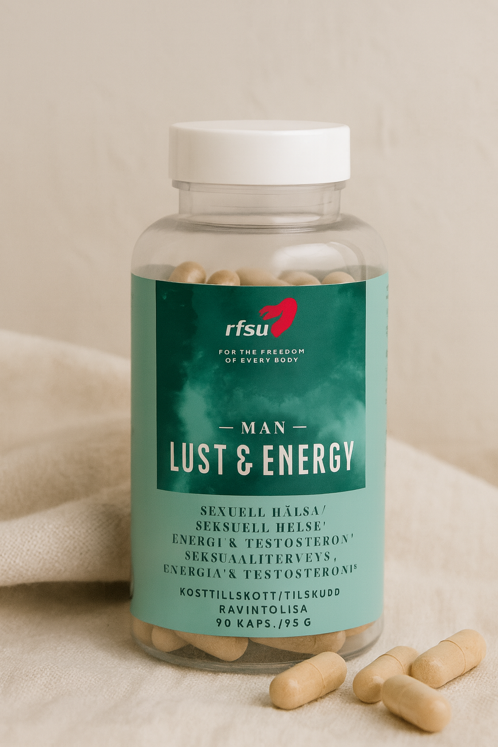 RFSU Lust och Energi Man är ett kosttillskott speciellt framtaget för män som vill öka sin energi, lust och vitalitet. Innehåller L-Arginin, vitaminer och mineraler som bidrar till normal energiomsättning och kroppens funktion. Tillskottet är rikt på antioxidanter för att skydda cellerna mot oxidativ stress och stödja immunförsvaret. Det är enkelt att använda och ger en naturlig boost till både kropp och själ. Perfekt för den som vill känna sig piggare, mer motiverad och förbättra sin prestationsförmåga. En burk innehåller 100 tabletter, vilket räcker länge och gör det till ett praktiskt val i vardagen.
