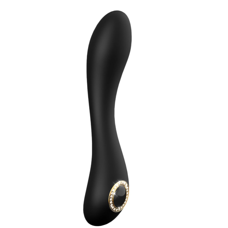 Prestige Natasha – en fantastiskt elegant G-spot-vibrator i mjuk svart silikon med guldaccent och juvelliknande knapp. Drivs med USB-laddning, har 7 vibrationsmönster & 3 hastigheter, är helt vattentät (IPX7) och säker för kroppen – njut i full lyx.